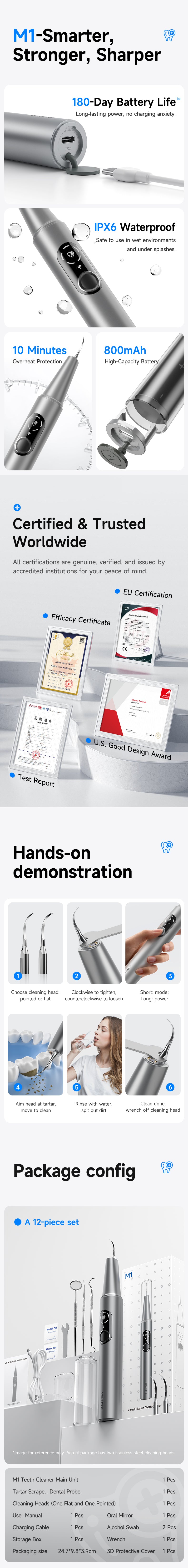 FDA-certified for safety and quality, the M1 provides professional-level oral care without expensive dental visits. Regular use not only improves oral hygiene but also helps prevent gum disease and tooth decay.